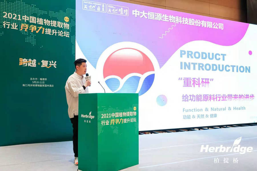2021年5月20-21日第12屆中國植物提取物行業(yè)競(jìng)爭(zhēng)力提升論壇在海口市舉行,河南中大恒源生物科技股份有限公司銷售總經(jīng)理金子恒應(yīng)邀參會(huì),并在論壇作了《“重科技”給功能原料行業(yè)帶來的進(jìn)步》主題演講,引發(fā)與會(huì)人員的廣泛關(guān)注。